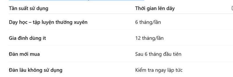 Sau 6–12 tháng, dây đàn sẽ giãn tự nhiên khiến âm thanh lệch tông. Lên dây giúp âm thanh trở lại độ chính xác ban đầu.