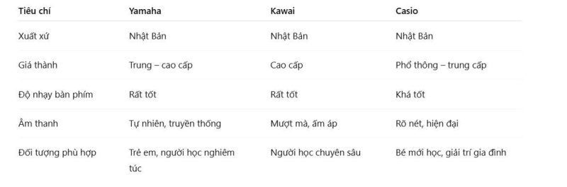 • Yamaha: Chất lượng ổn định, phù hợp đa số nhu cầu học.